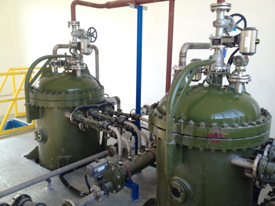 2台63㎡自动反洗精密过滤器,用于黄金冶炼废水经石灰乳中和后,浆液直接过滤,回用生产。
