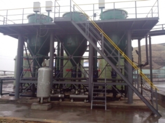 2台40㎡自动清洗精密过滤干渣设备,用于烟气脱硫循环液处理工段,其待处理废水中含有一定量的硫酸盐颗粒物,因此要将其硫酸盐颗粒物进行回收利用,使用我公司的干渣设备来进行废水的过滤,并对滤后渣进行有效的回收利用,经投产运行后,使用效果良好,渣含水率60%。